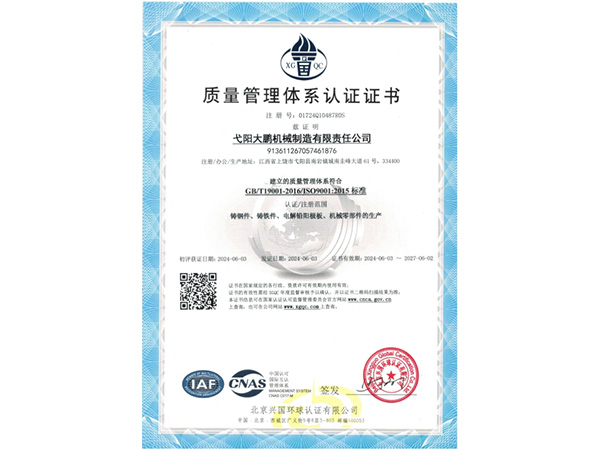 公司順利通過質量管理體系認證、環(huán)境體系認證、職業(yè)健康安全管理體系認證、環(huán)評。2015年5月獲國家工信委頒發(fā)的《鑄造企業(yè)準入條件》;2019年做了安全現(xiàn)狀評價;2020年取得了排污許可證。
